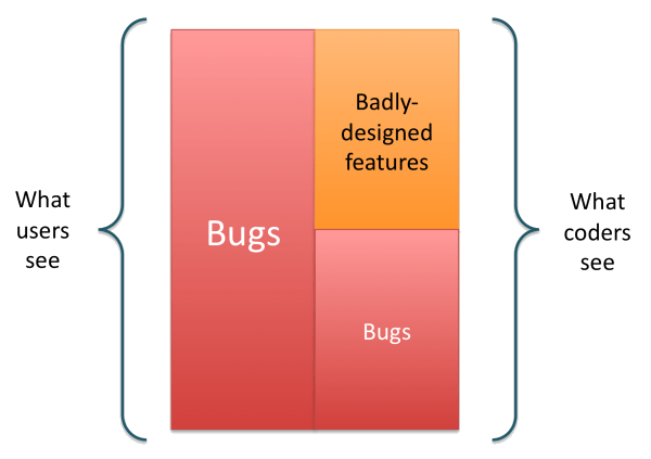 It doesn’t matter that your users can’t figure out what the heck to do with it. Or worse, they make incorrect assumptions about how it should work and get totally surprised by some weird side-effects it causes. For a coder, a bug is something completely different, like an exception or a computation error.