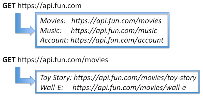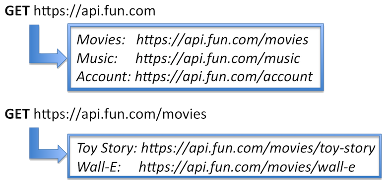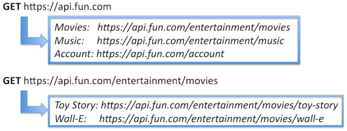 Imagine an API for an online entertainment company (let’s call them Fun.com) that streams both movies and music. Thankfully, the folks at Fun.com have learned enough about REST that they only guarantee a long life for the top-level URI (https://api.fun.com). That means that well-behaved clients will hard-code just that single entry-point, and will only follow other URIs that are returned to them as part of their normal interactions beyond that point.