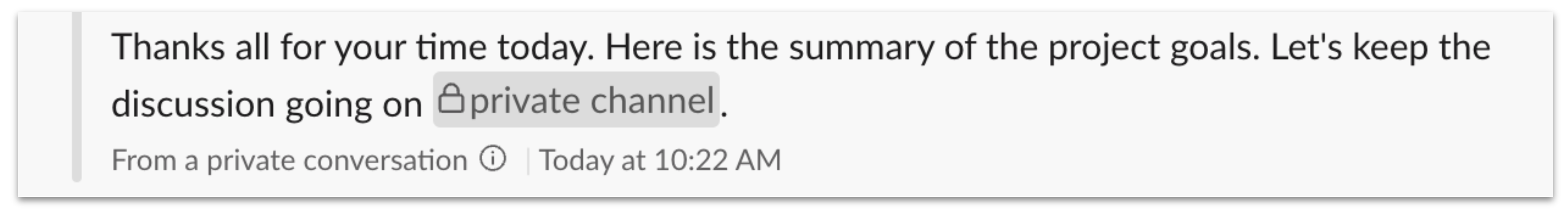 That said, it’s important to recognize that private channels and DMs do have their place, and people do need a place to discuss things safely. The solution is to have just those conversations in a private channel. Once any conversation moves back to project work from which others could benefit, it should move to a public channel focused on that project.