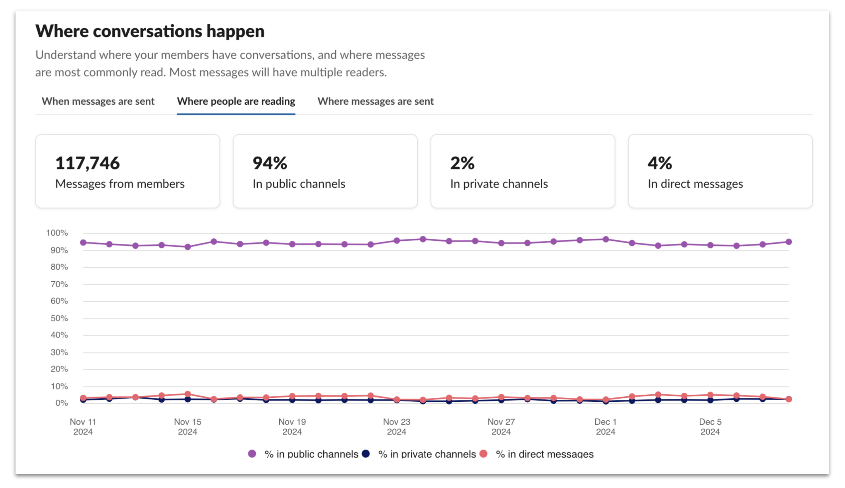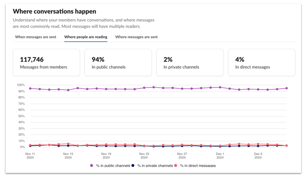 Slack has useful analytics – available to all members – on how many messages are sent or read in public, private, or direct channels.